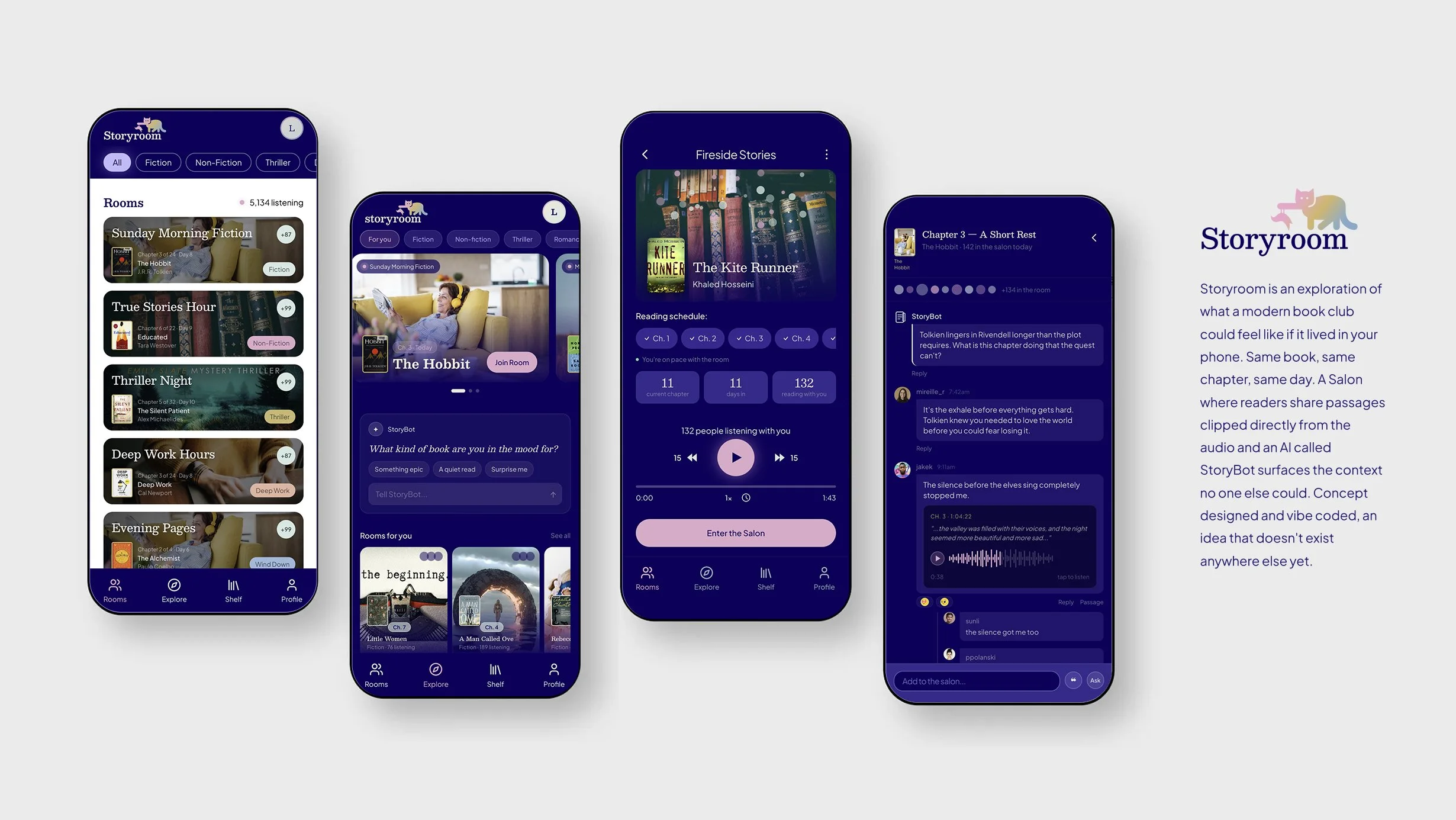 The core idea became Storyroom. Same book, same chapter, same day. A virtual room where people listen on their own schedule but share a pace. At the end of each chapter they gather in a Salon to talk about what they heard — sharing passages clipped directly from the audio, responding to each other, building a conversation around the book they just experienced together.