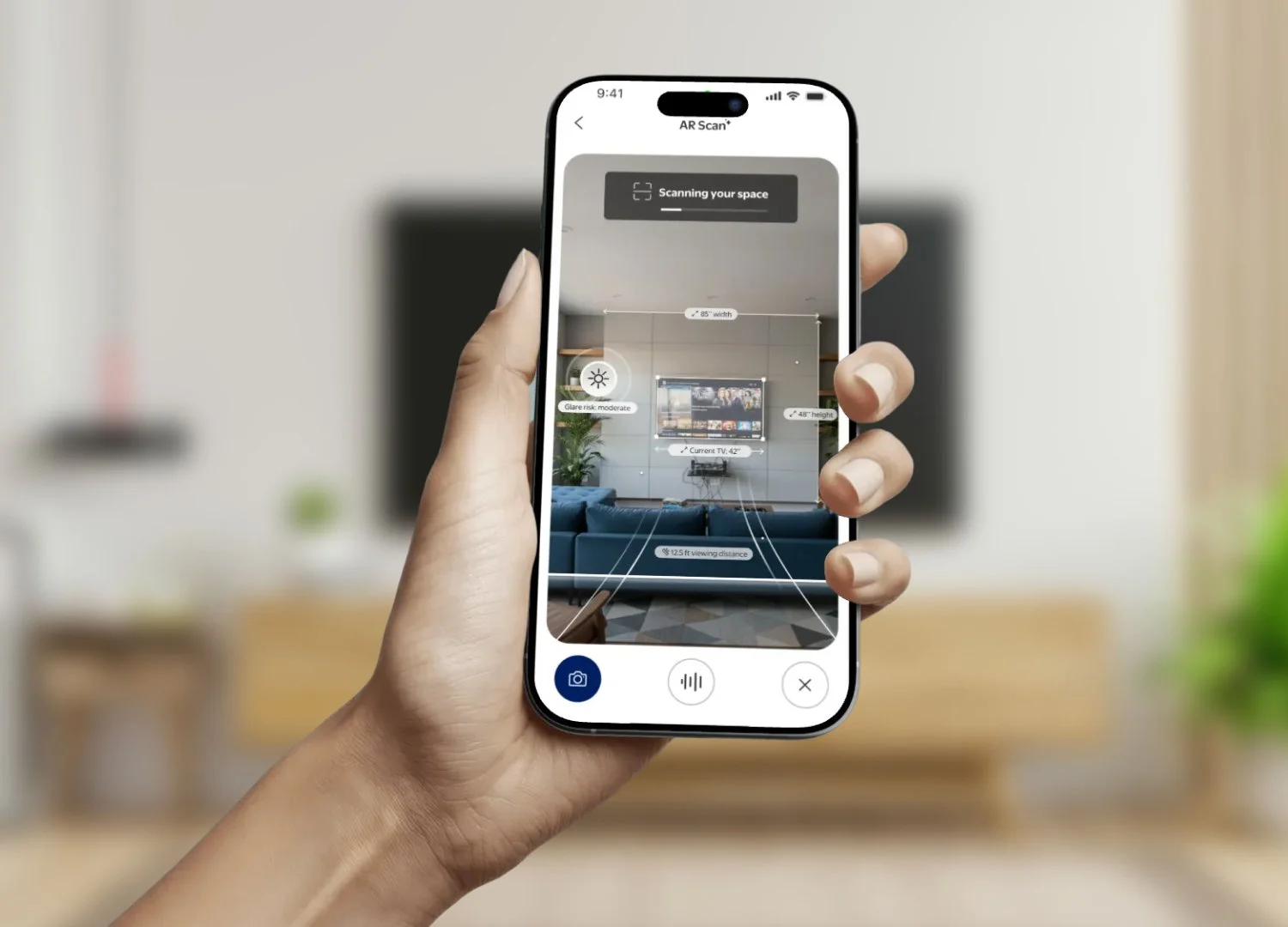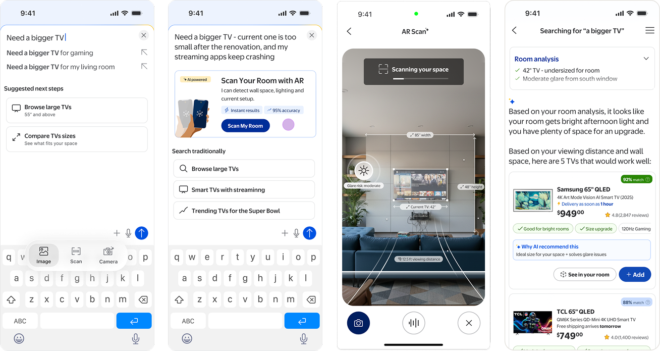 A Walmart customer is looking for a new TV. She uses a multimodal video for AI to scan measurements and the lighting in her space to gain context insights to make intelligent recommendations.