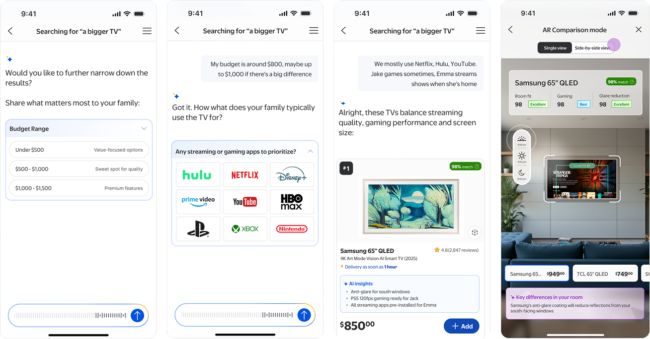 Using AI search chat, the user answers simple quiz to get higher confidence recommendations. She then uses AR to compare the 3 TVs in her room.